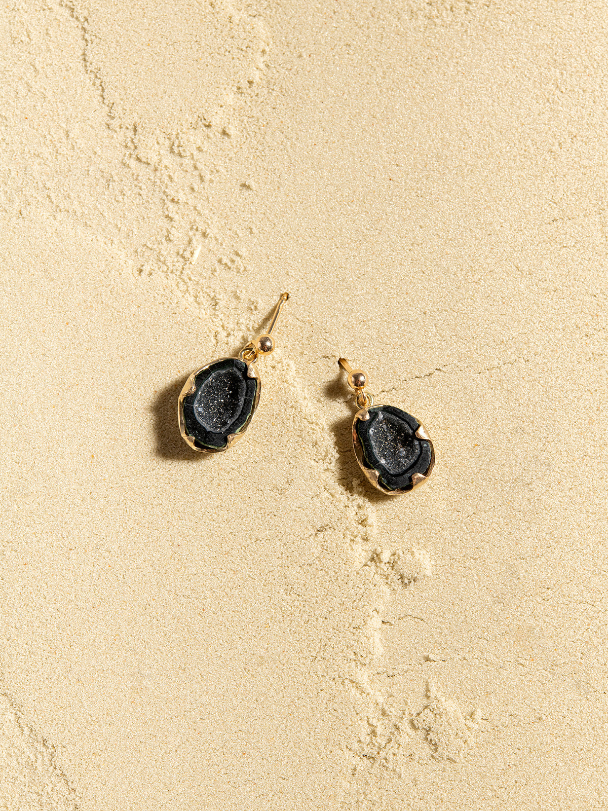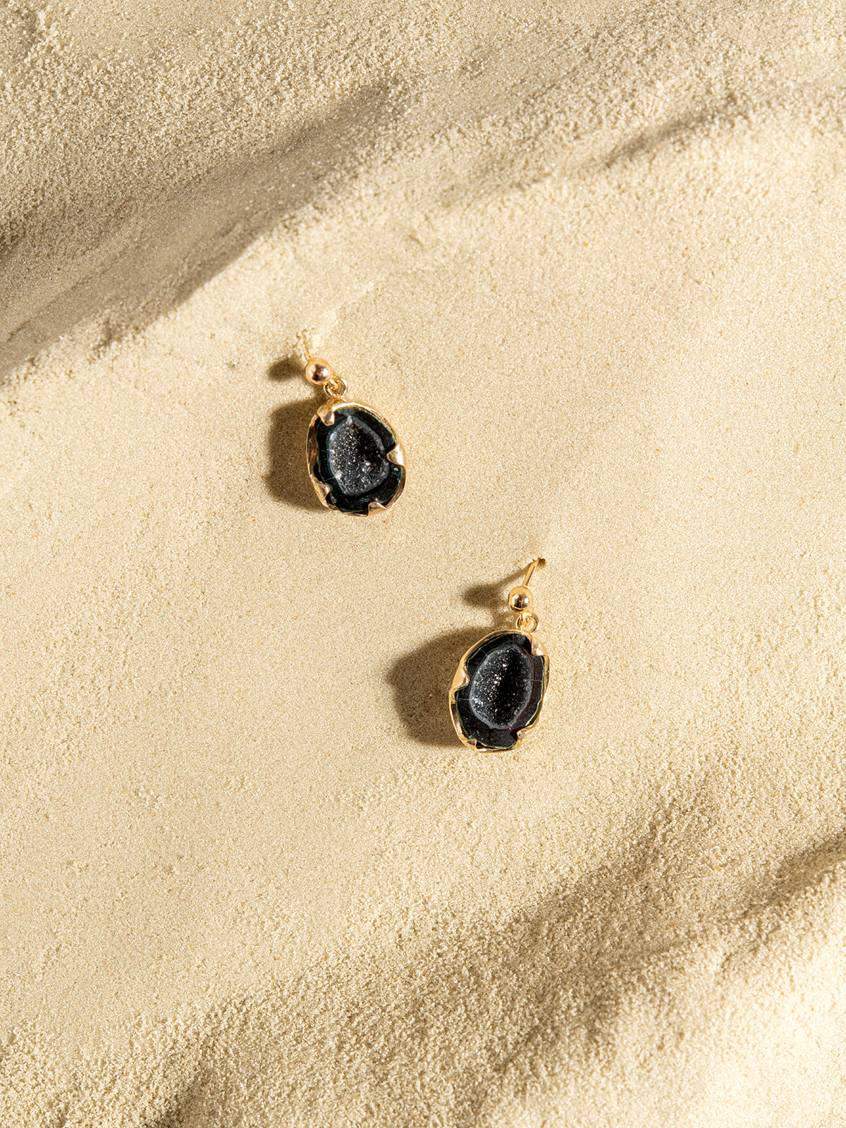 ביצת אגט יחודית, חתוכה לשניים, היא מה שמרכיב את זוג העגילים האלה.