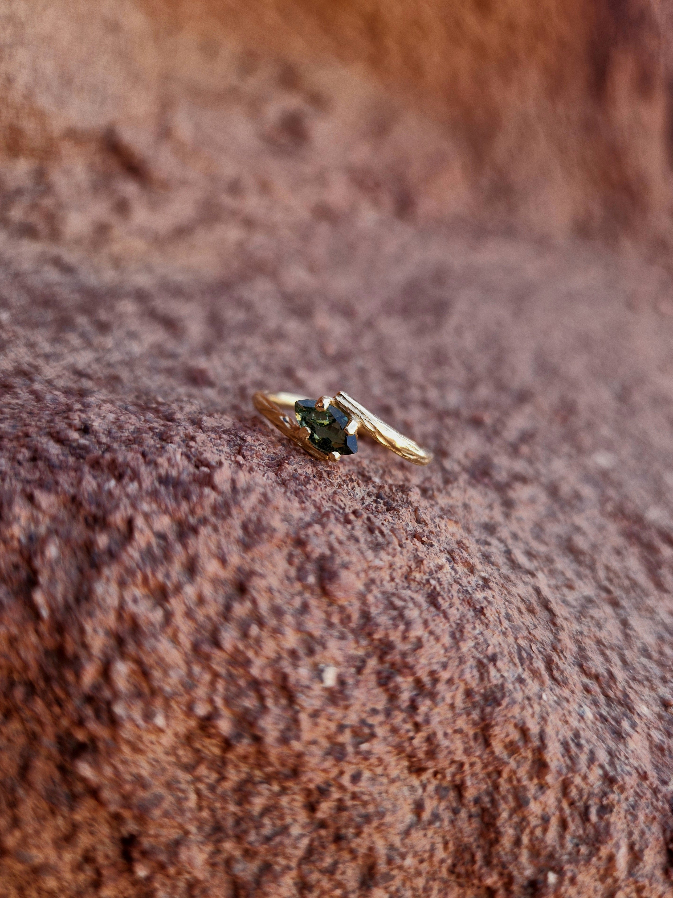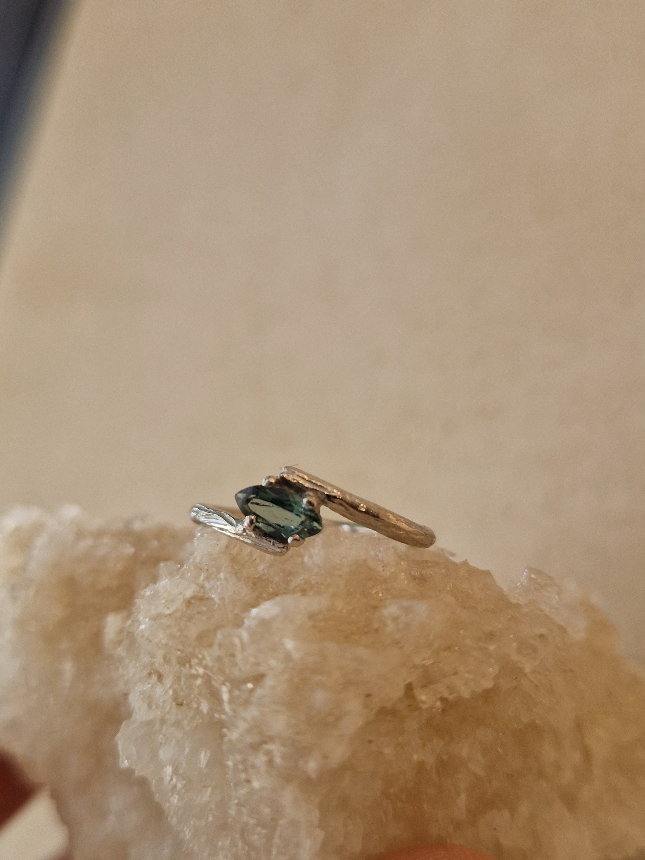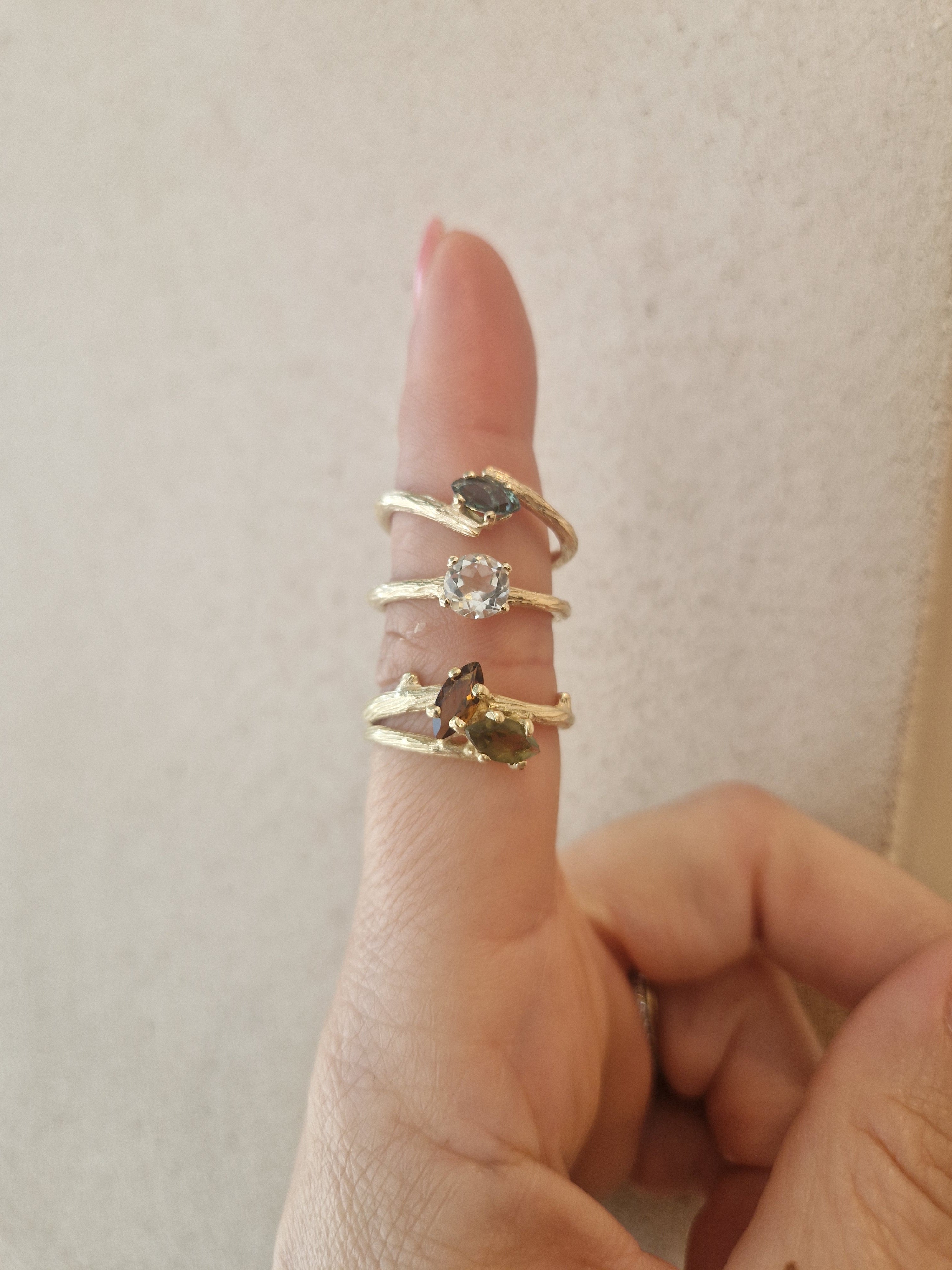 טבעת בזהב 14K בטקסטורה אורגנית ועיצוב מעוקל החובק במרכז אבן טופז בחיתוך מרקיזה, המוסיפה קסם טבעי ועשיר שמושך את העין.