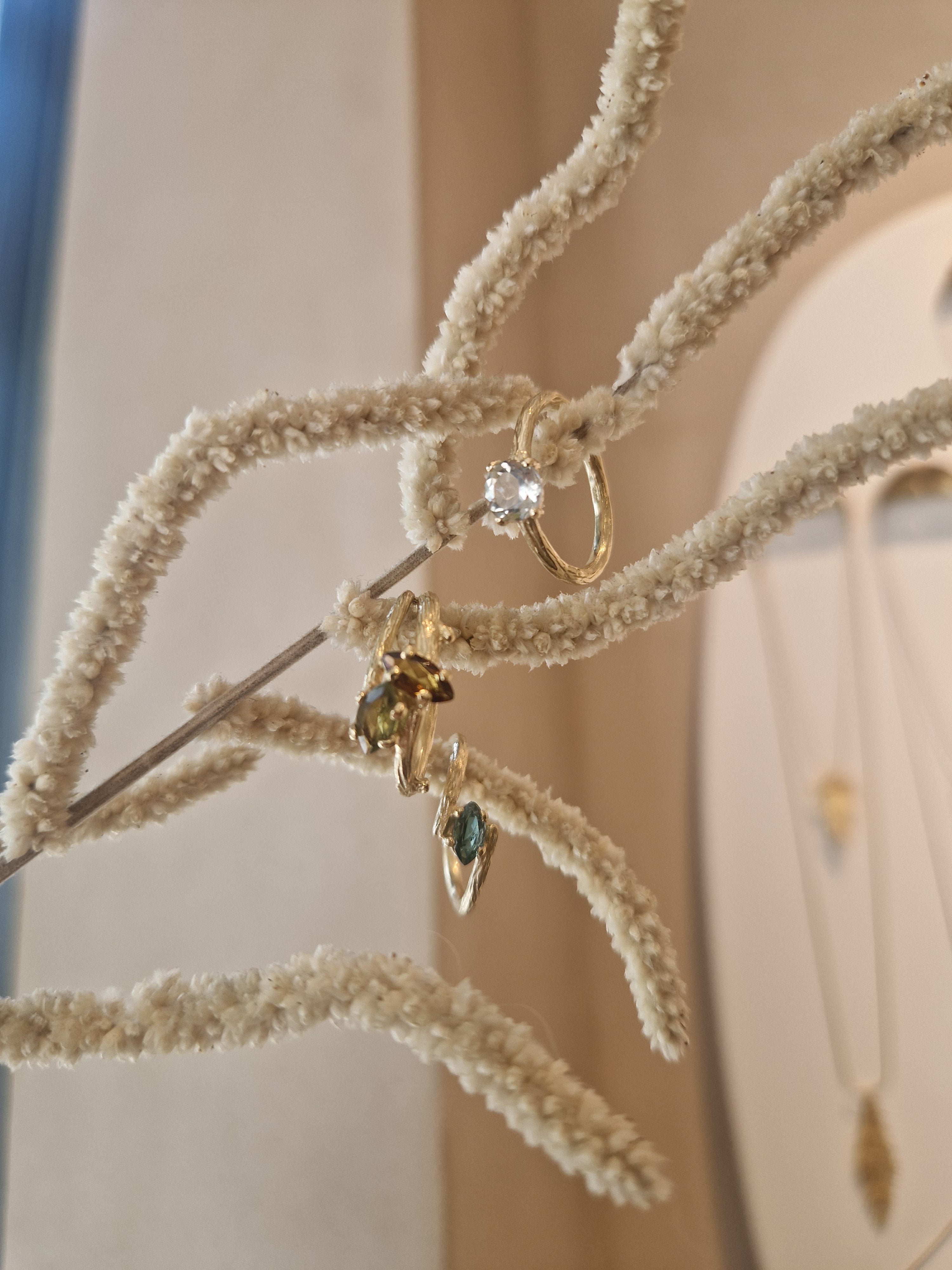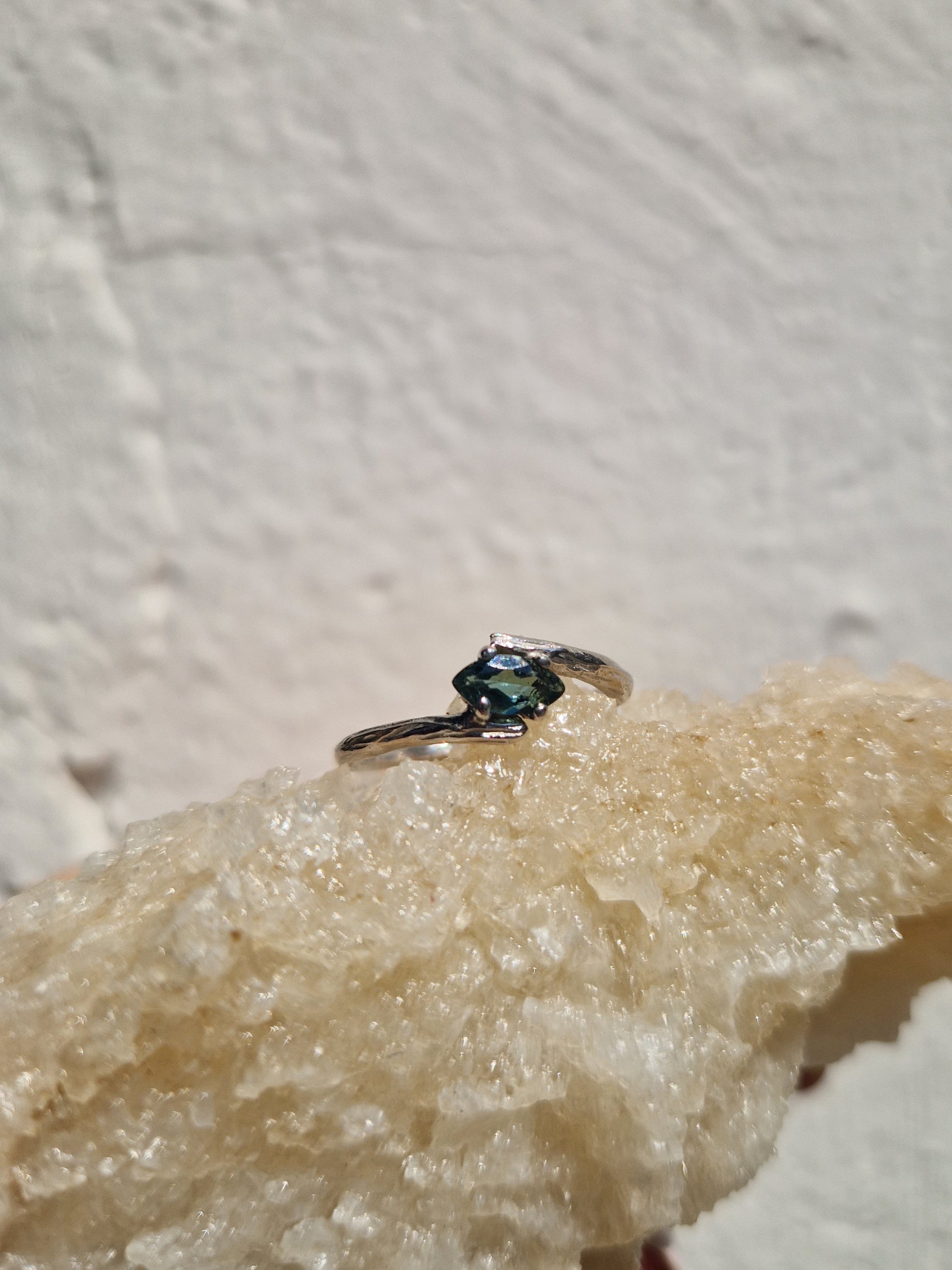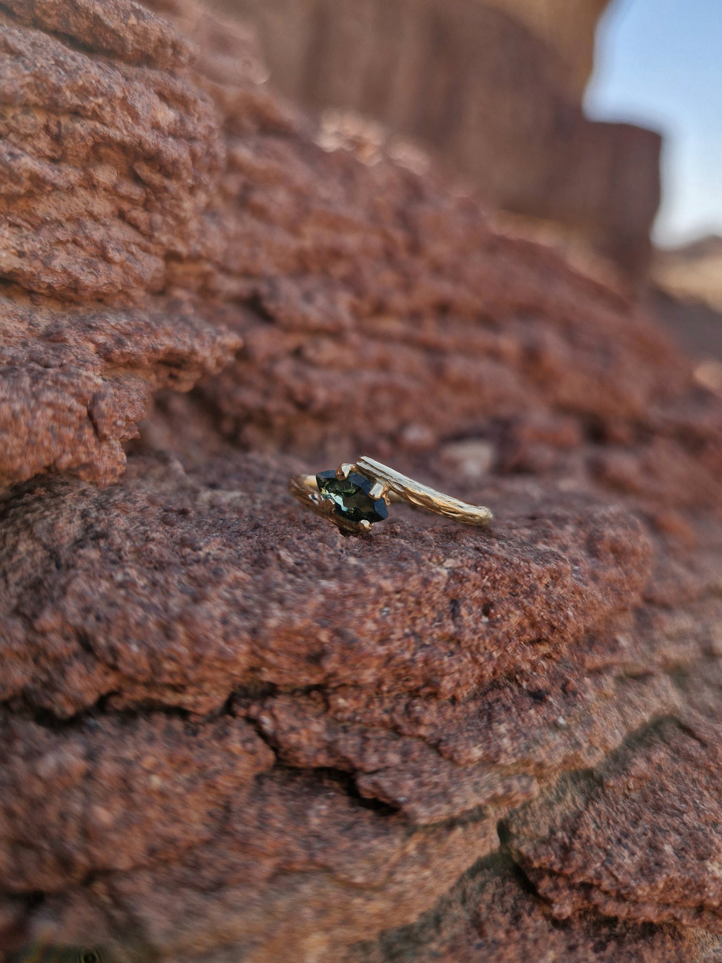 טבעת בזהב 14K בטקסטורה אורגנית ועיצוב מעוקל החובק במרכז אבן טופז בחיתוך מרקיזה, המוסיפה קסם טבעי ועשיר שמושך את העין.