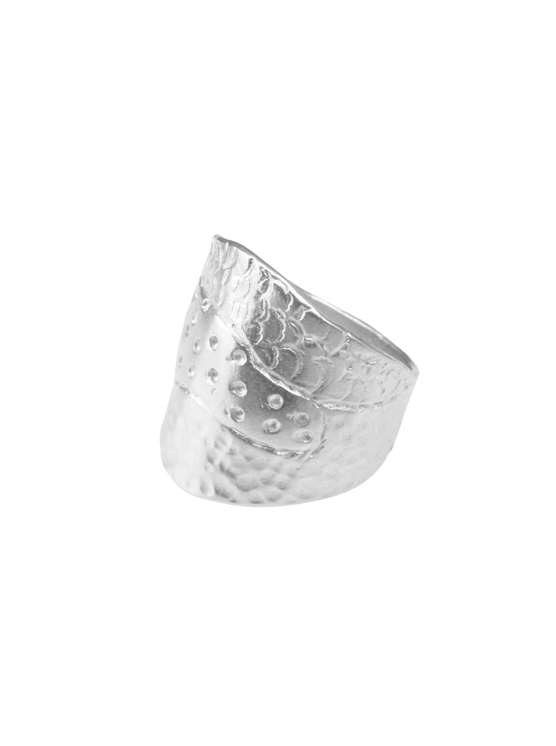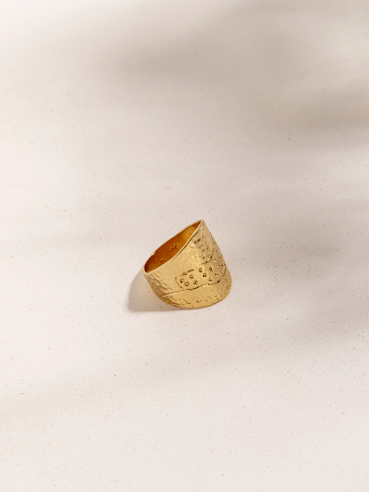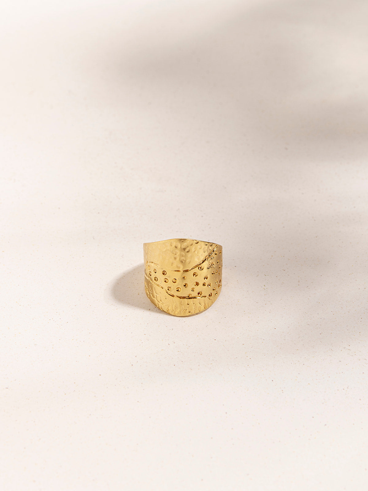 טבעת זהב רחבה בהשראת הטבע, עם טקסטורות מרוקעות. כאילו מביטה ממעוף הציפור, הטבעת הזו לוכדת את פני האדמה השונים: אוקיינוס ​​גלי, שדות ירוקים, דיונות של חול וכן הלאה.