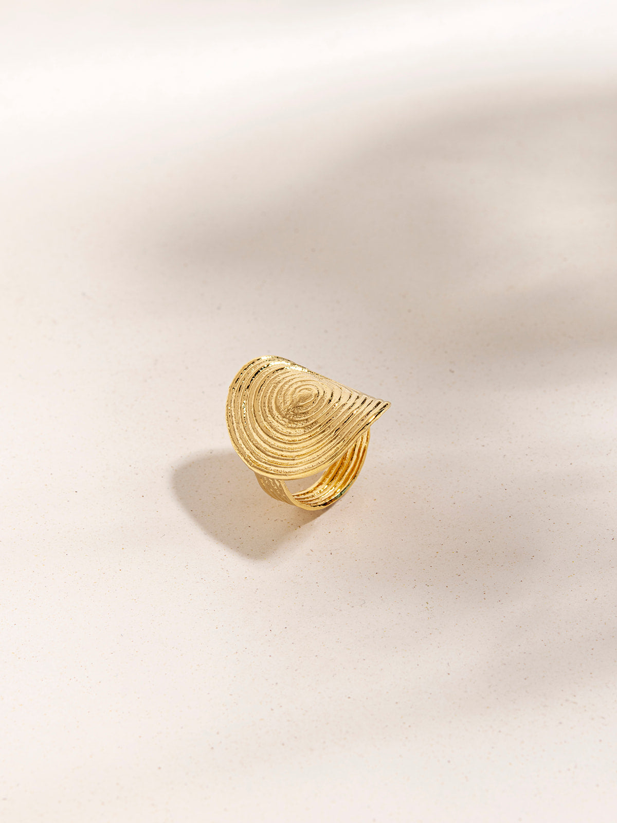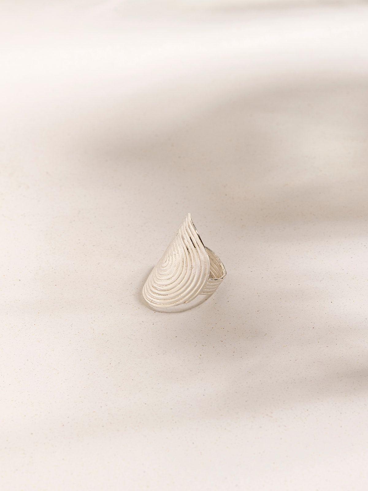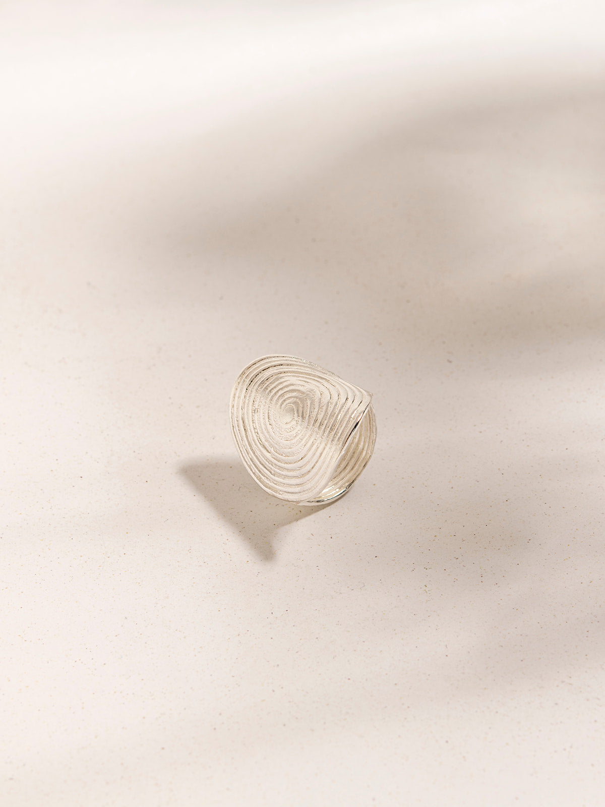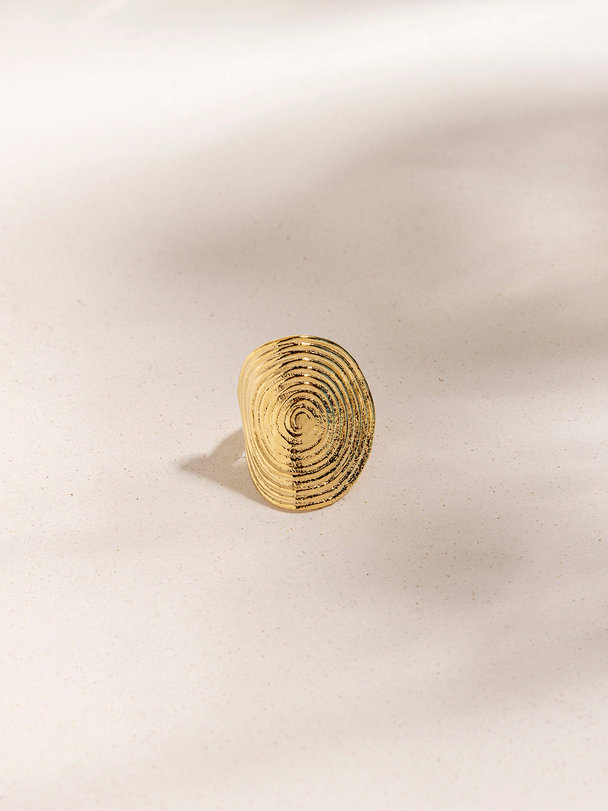 לטבעת הדרמטית הייחודית הזו יש חלק עליון ספירלי עגול מכופף. הספירלה "מתחבאת", זורמת פנימה בין האצבעות. הגימור שלה מאוד עשיר.
