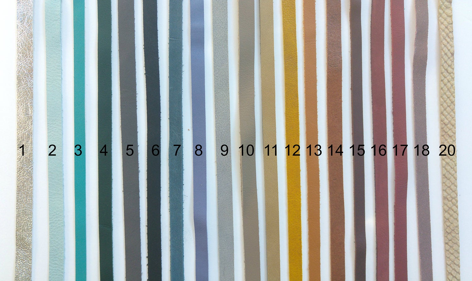 Silver (1), Baby Blue (2), Turquoise (3), Forest Green (4), Dark Gray (5), Black (6), Torn Blue (8), Purple (8), Light Gray (9), Clay (10), Taupe (11), Mustard (12), Ginger Brown (13), Brown (14), Chocolate (15), Maroon (16), Red (17), Vintage Pink (18), Snake Skin (20)