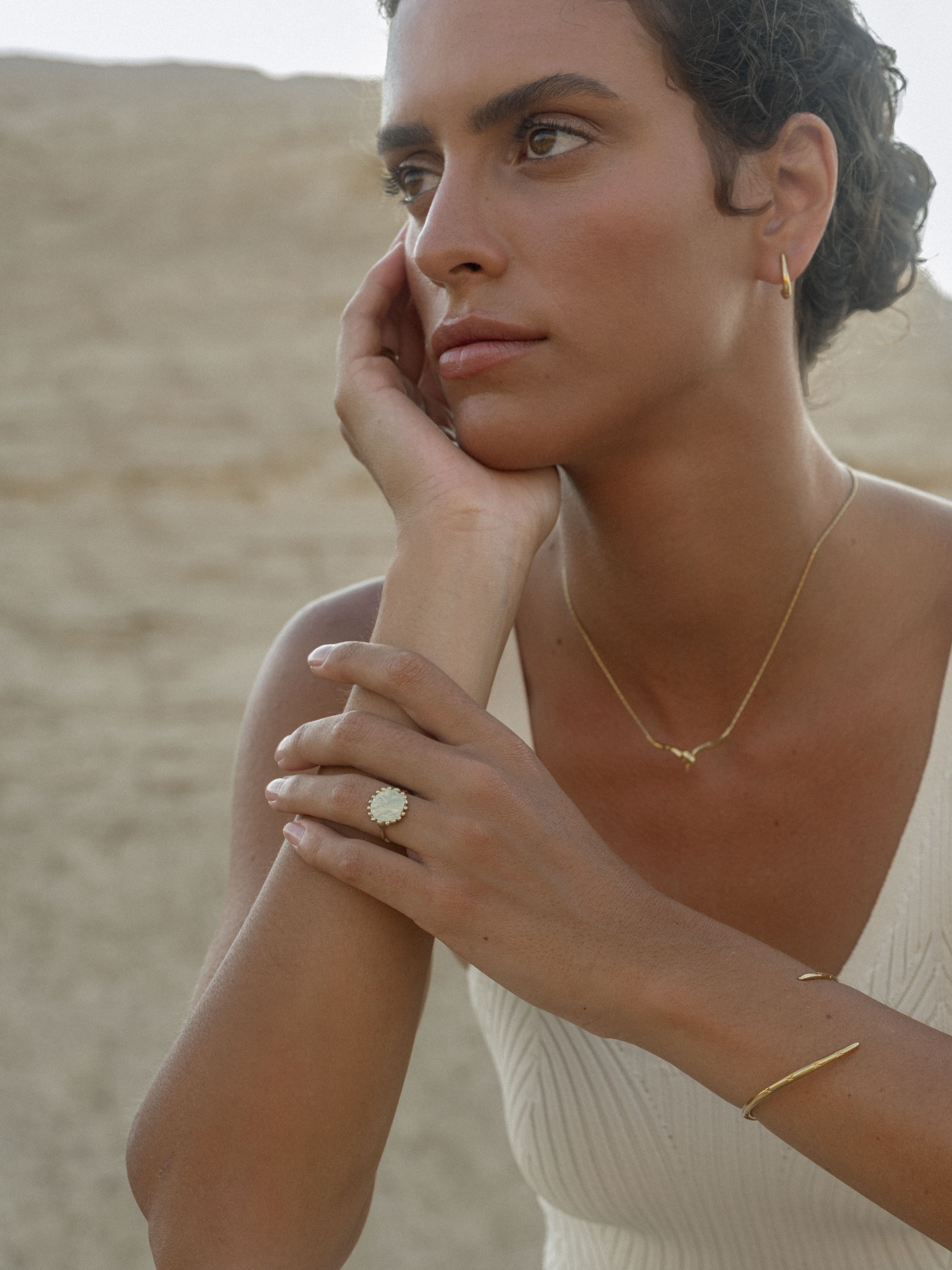 The jewelry is coated in 24k high quality gold. In order to prolong the initial look of the piece, it is recommended not to shower with it, not to wear it on while at the beach or pool and to prevent any direct contact of the piece with perfumes or creams.