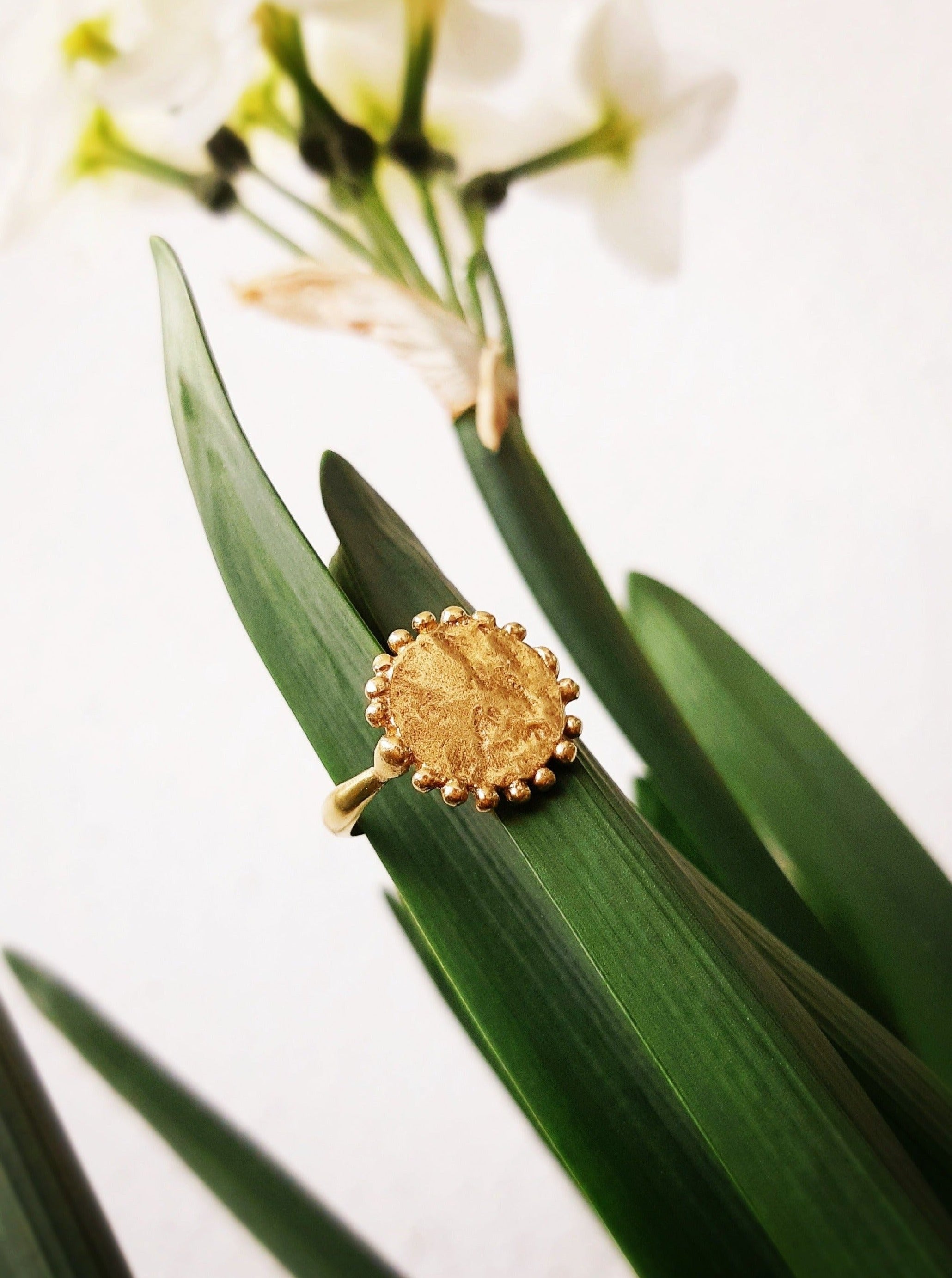 This solid 14k gold signet ring has a textured surface decorated with granulation.