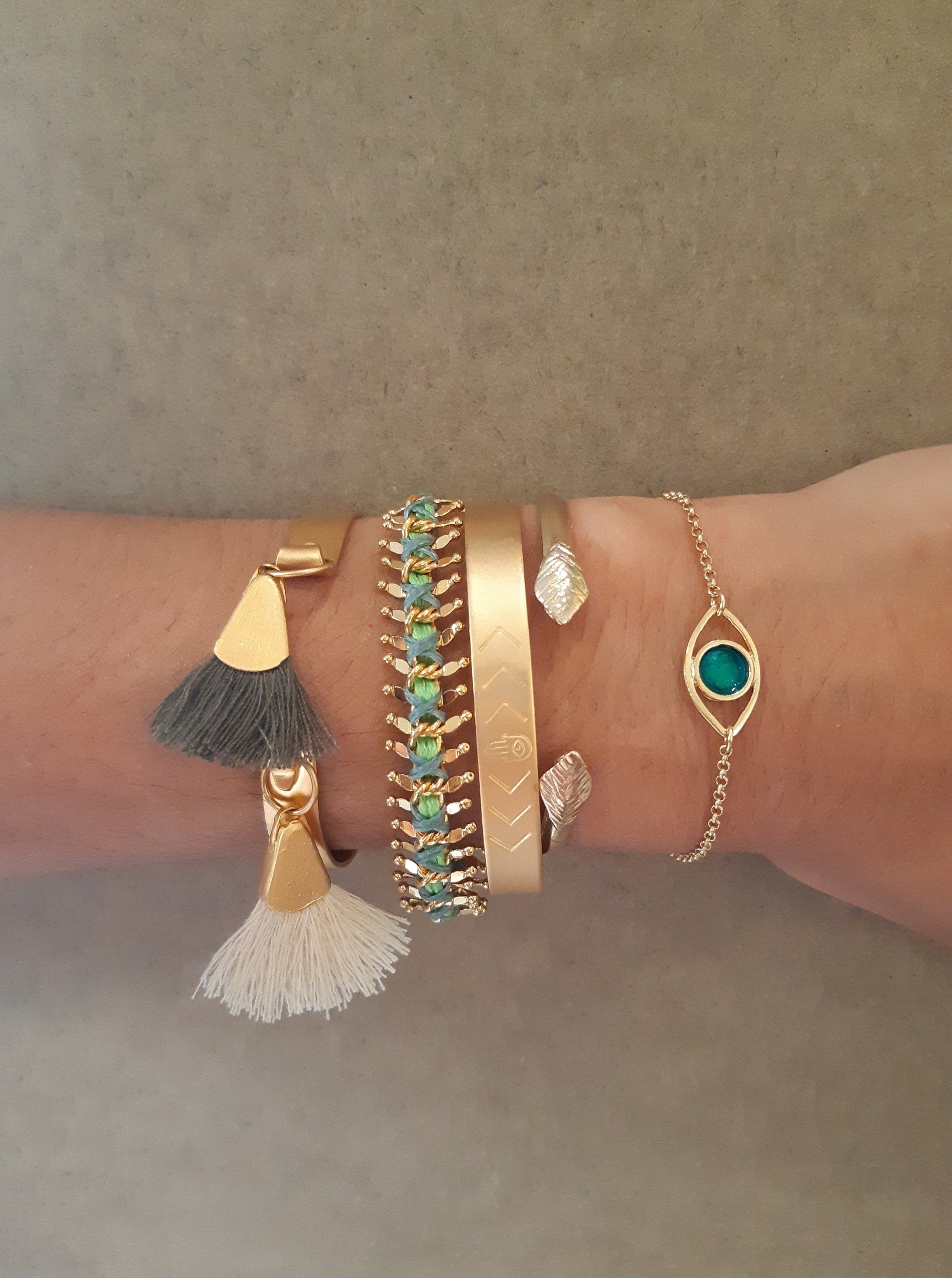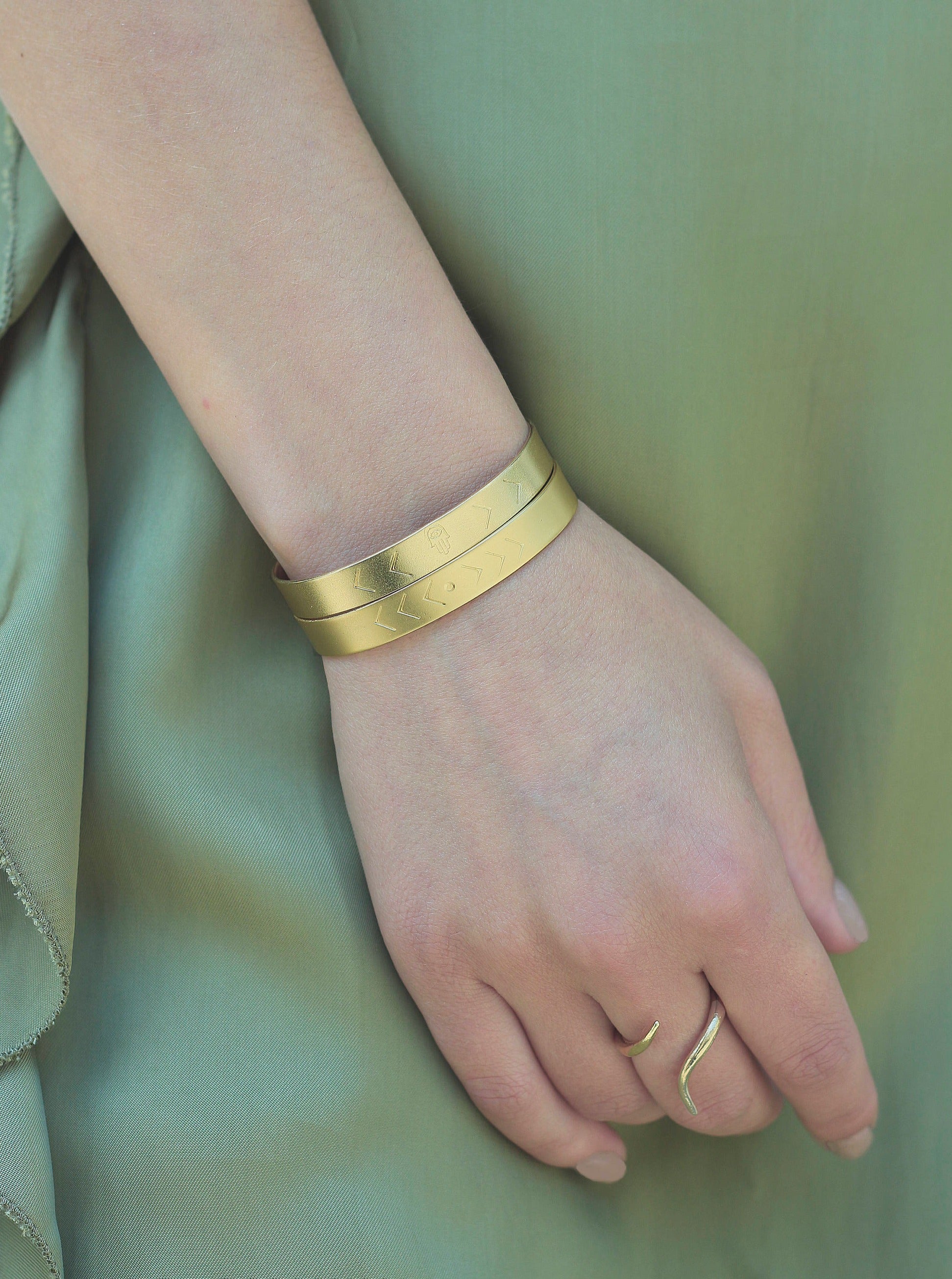 - Each bracelet is hand engraved, and finished with a curved and folded end that can be worn on top.