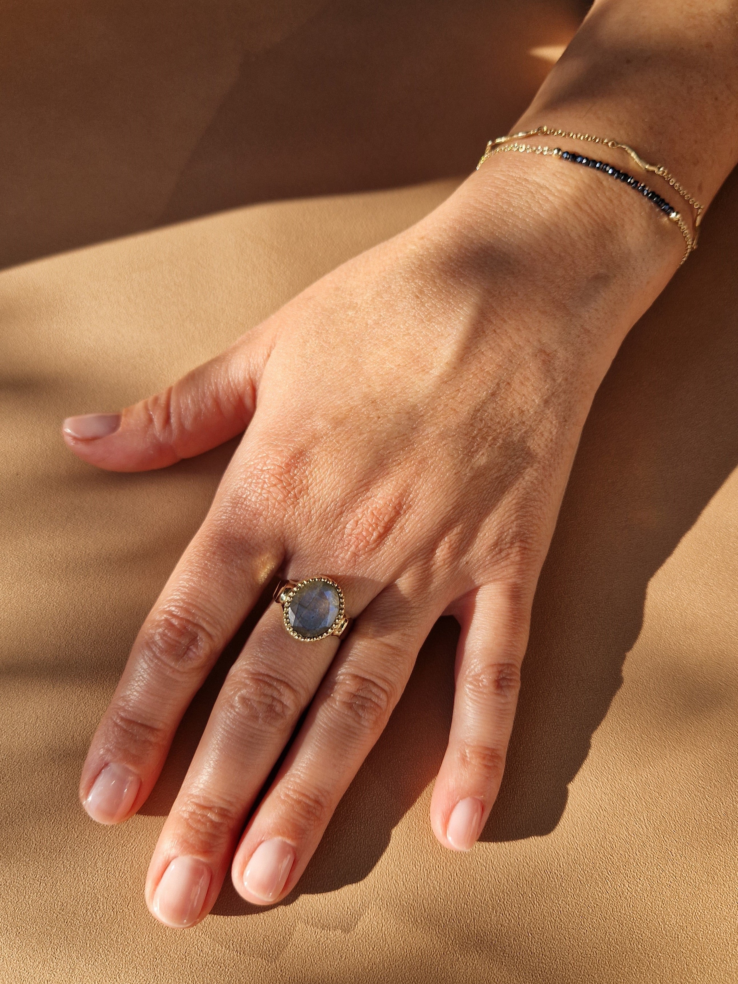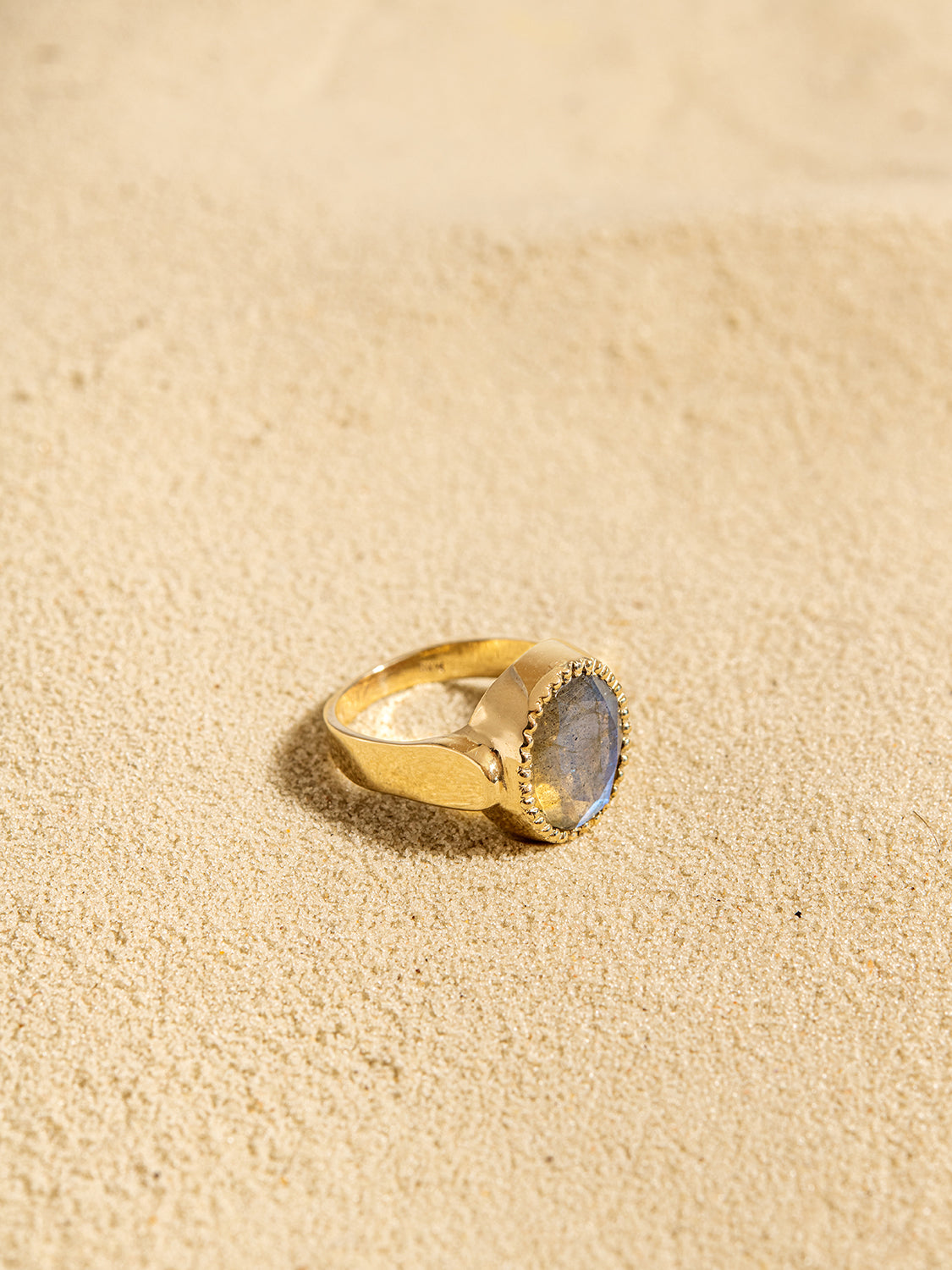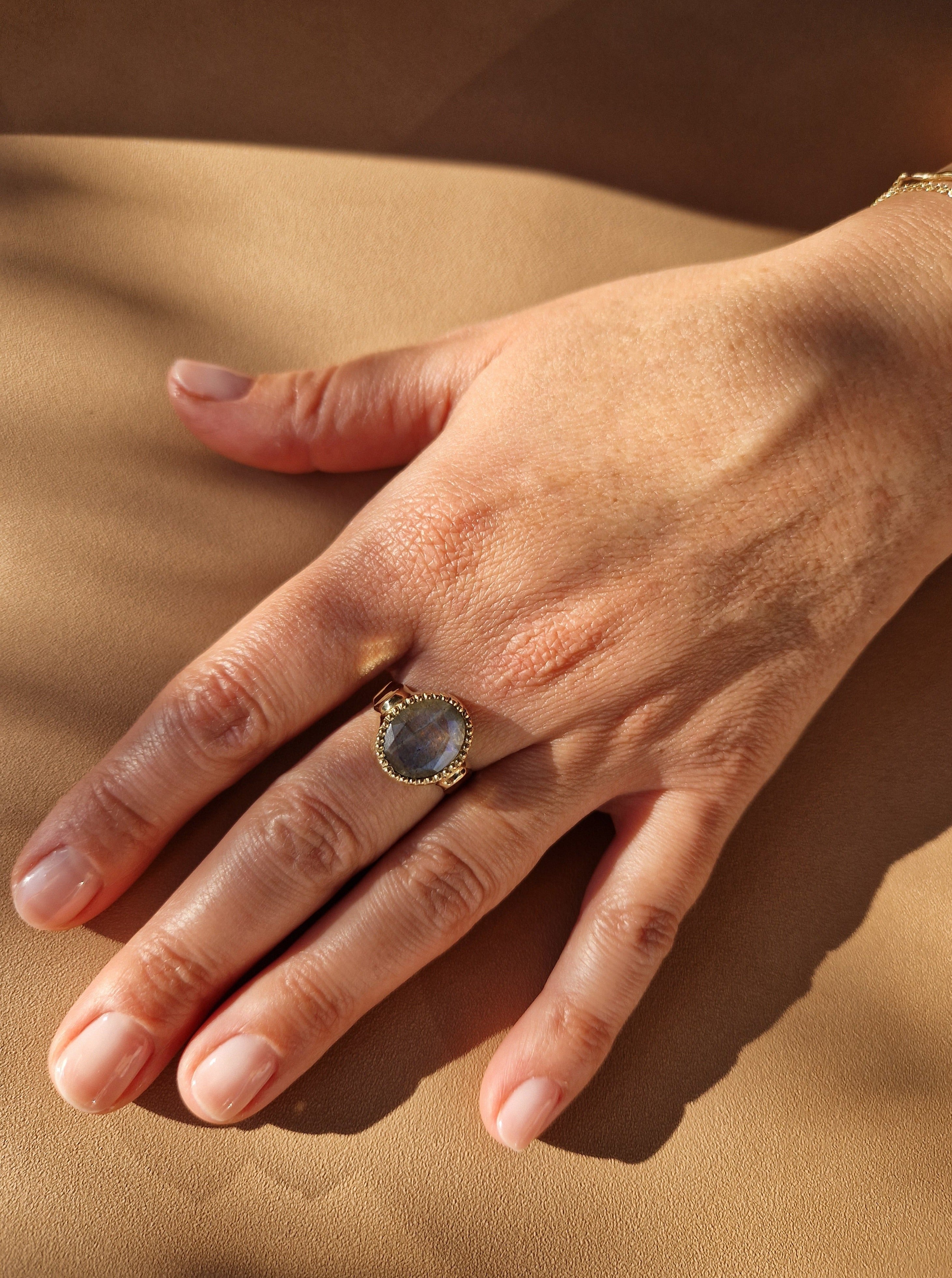 It is made of solid 14k gold and set with a facet grey labradorite, a stone known for it's balancing and relaxing qualities .