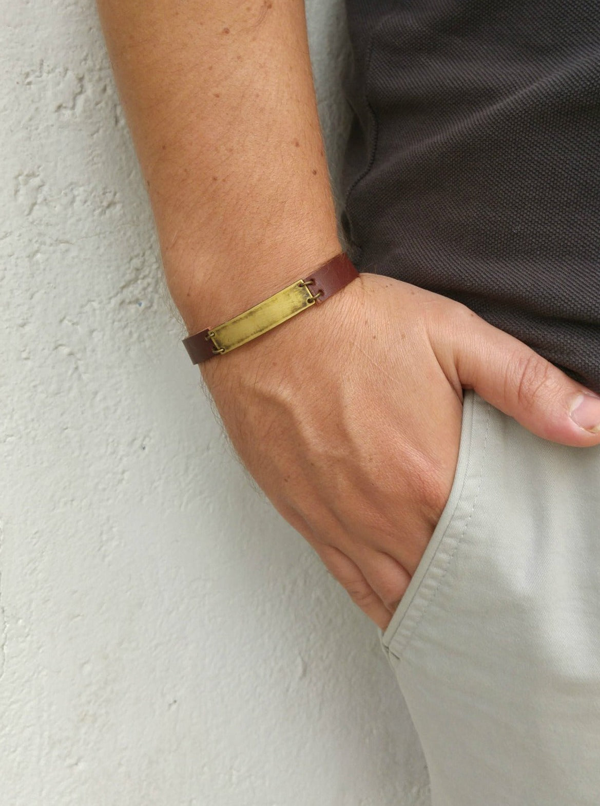 Mens Personalized leather bracelet with a brass plate to customize with a name or any other message, a great gift for anniversary or any other special occasion